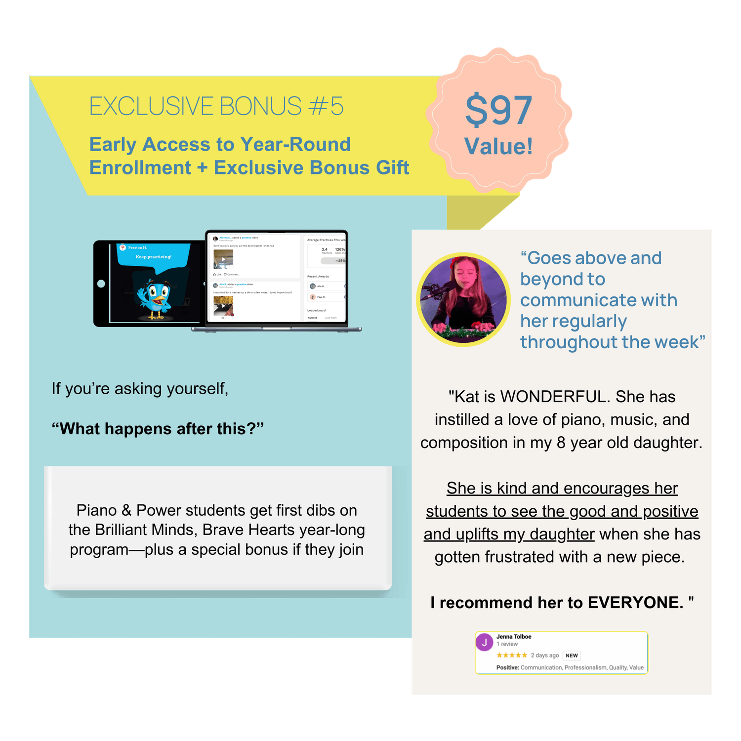 Families who complete Piano & Power will get first access to our year-round leadership and piano program: Brilliant Minds, Brave Hearts.