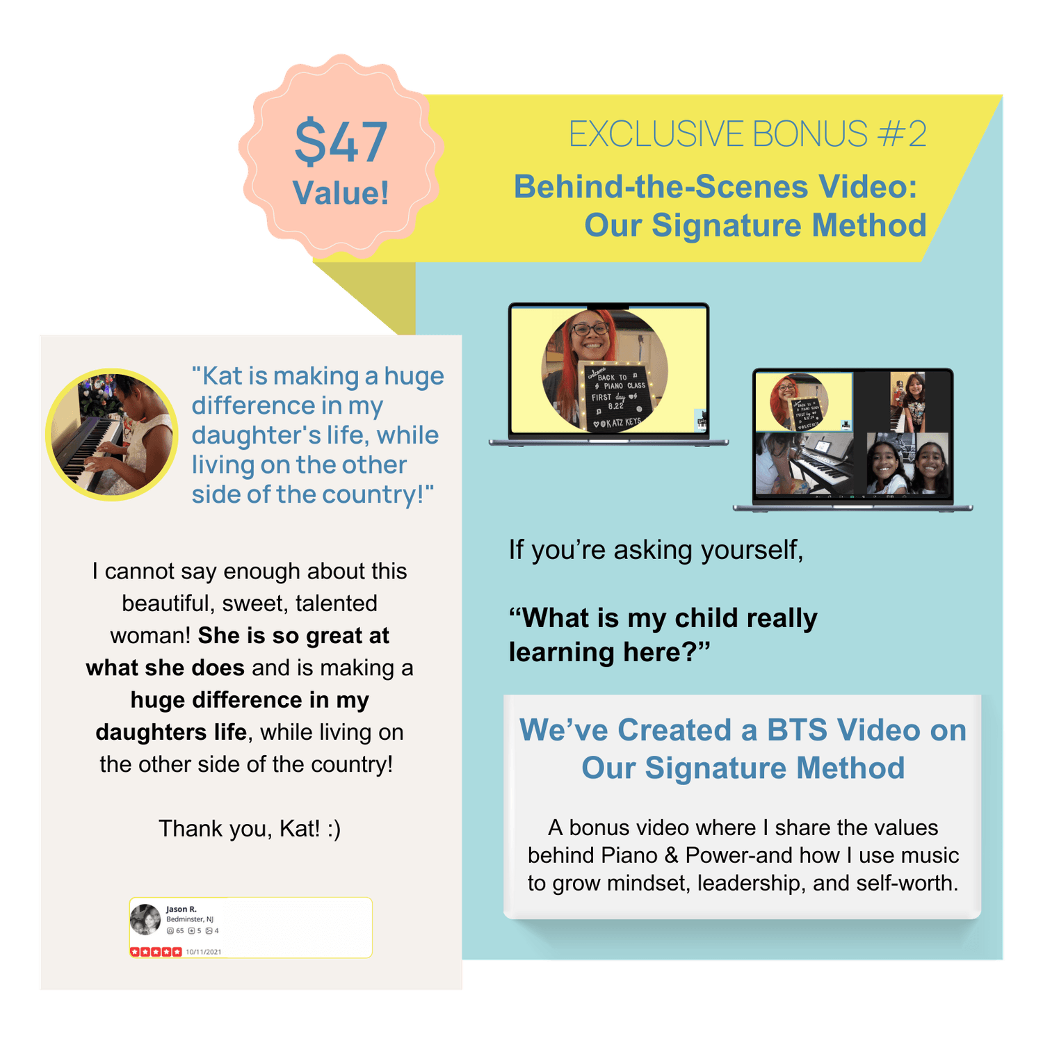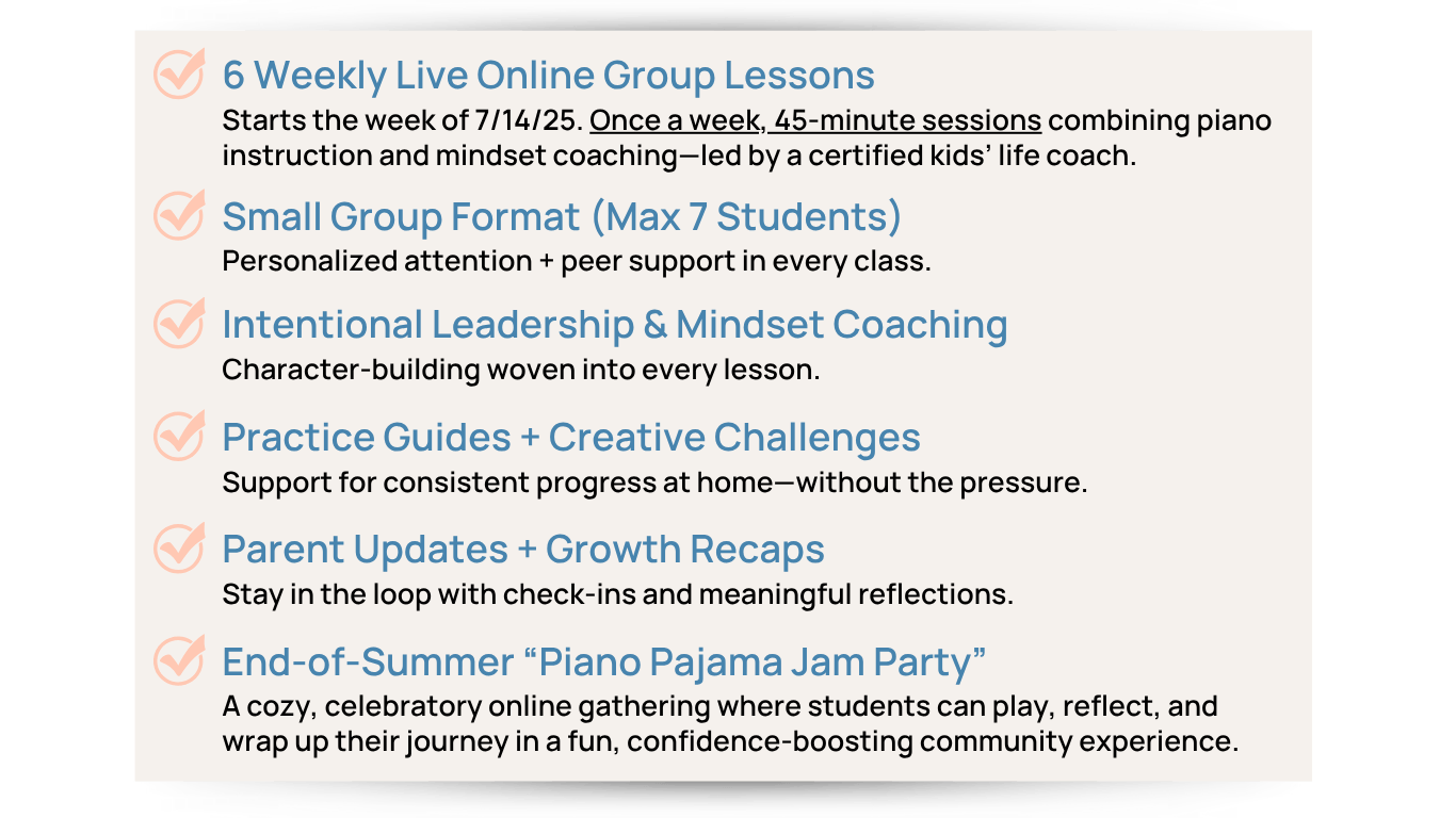 Starts the week of 7/14/25. Once a week, 50-minute sessions combining piano instruction and mindset coaching—led by a certified kids’ life coach.